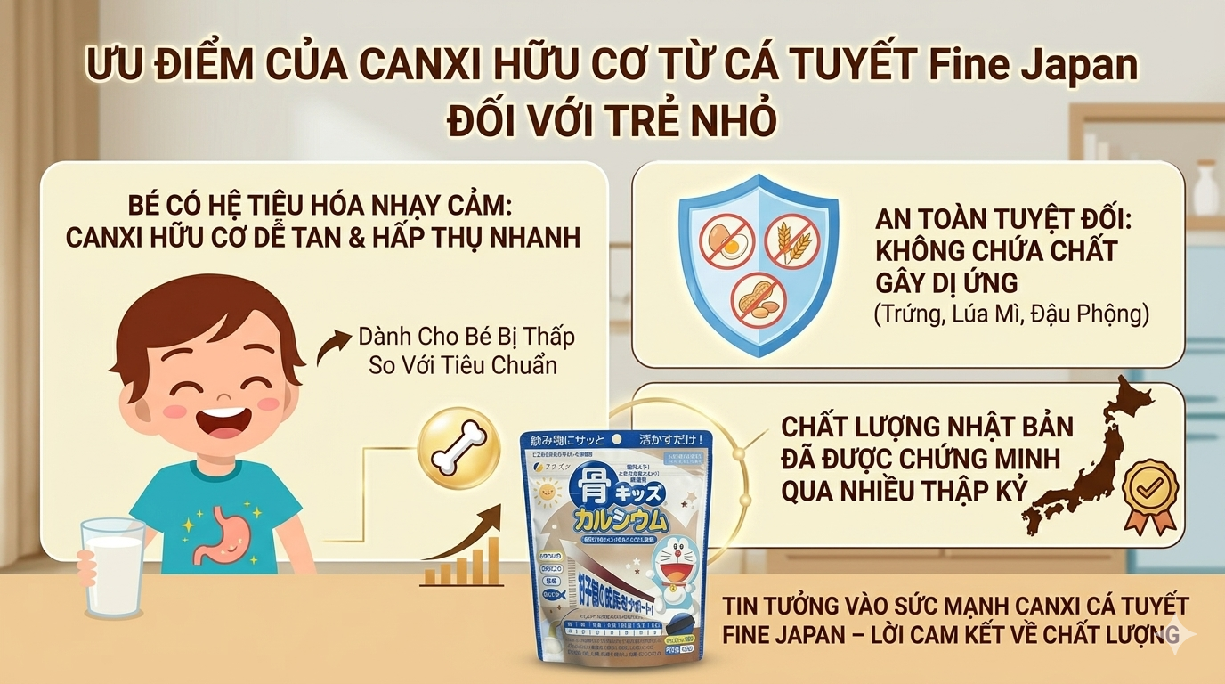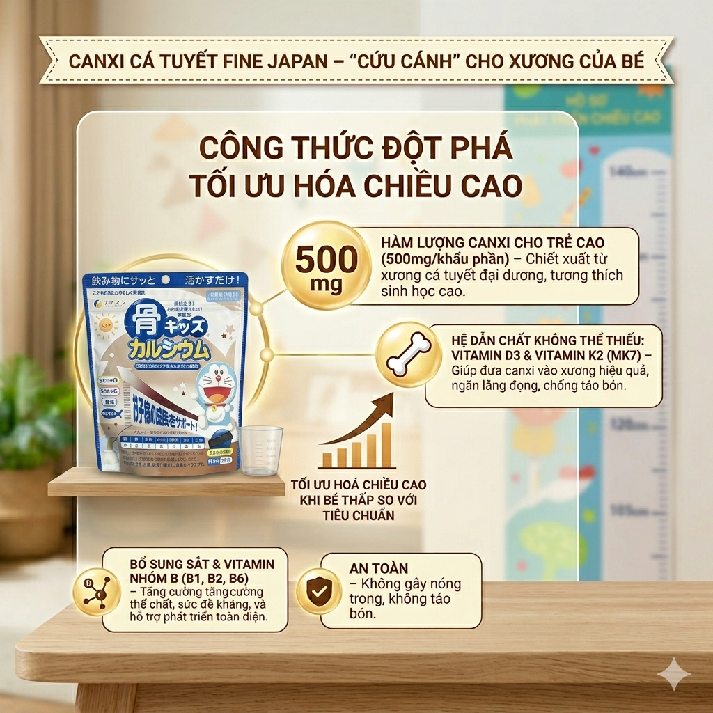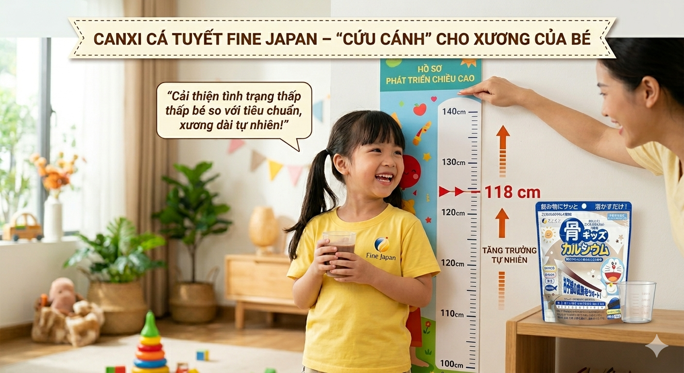 Nhiều phụ huynh tự hỏi vì sao con mình ăn uống đầy đủ nhưng vẫn bé bị thấp so với tiêu chuẩn. Nguyên nhân cốt lõi thường nằm ở việc cơ thể thiếu hụt lượng canxi cho trẻ cần thiết hoặc khả năng hấp thu kém. Sản phẩm canxi cá tuyết Fine Japan được ra đời nhằm khắc phục tình trạng này bằng cách cung cấp nguồn canxi hữu cơ tinh khiết.