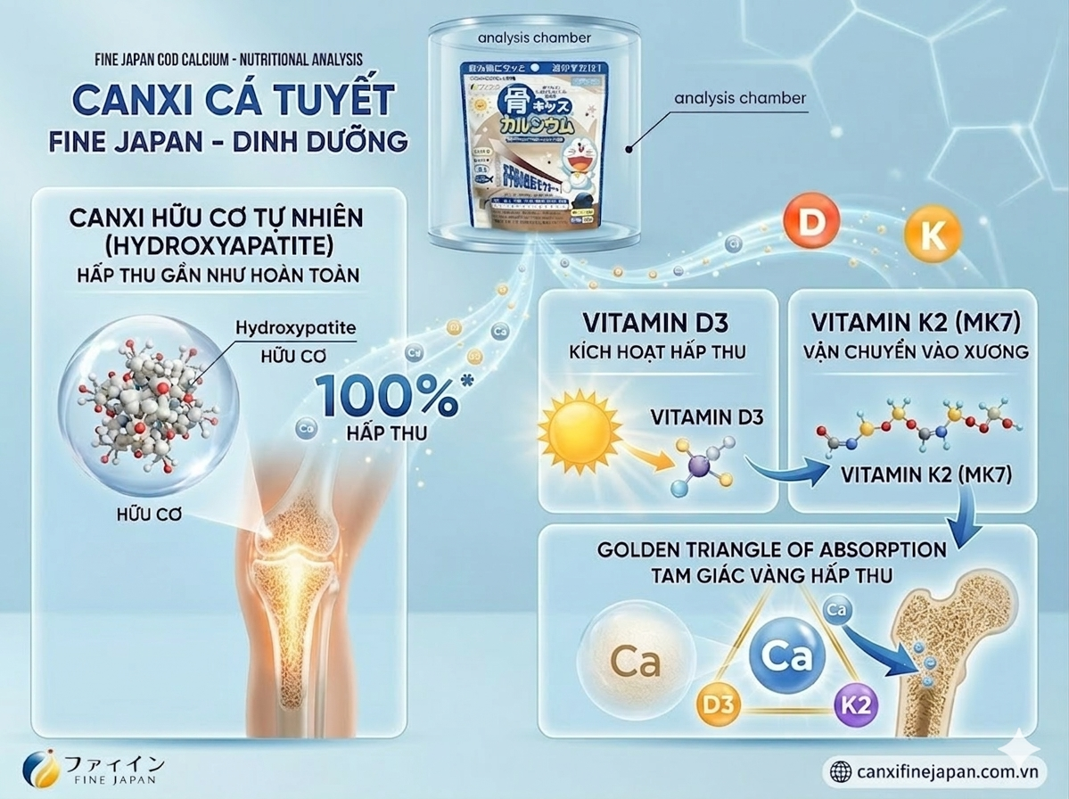 Kiểm nghiệm thực tế cho thấy canxi cá tuyết Fine Japan chứa hàm lượng Vitamin D3 và K2 vừa đủ để kích hoạt quá trình vận chuyển canxi vào xương. Nếu không có hai dưỡng chất này, việc bổ sung canxi cho trẻ sẽ trở nên vô nghĩa. Canxi cá tuyết Fine Japan đã giải quyết triệt để vấn đề này bằng công thức phối trộn độc quyền.